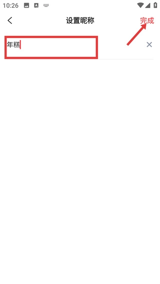 4、进入设置昵称的页面后,在对应的输入框里填好新昵称,接着点击页面右上角的“完成”按钮,这样就可以完成昵称的修改了。