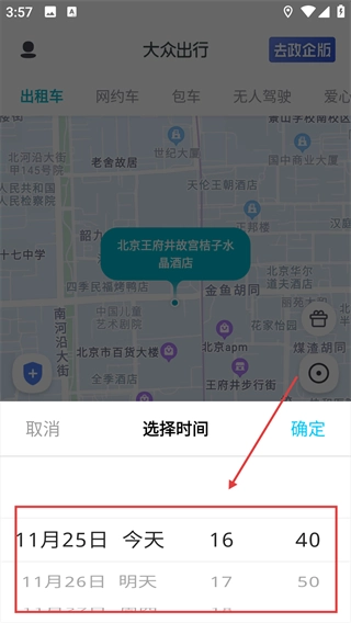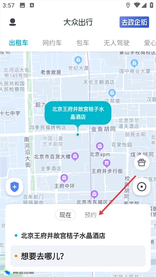 1、打开应用,点击“预约”选项,进入行程时间设置界面。