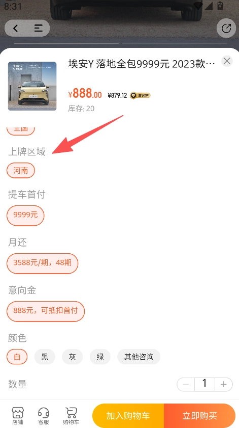3、选定上牌区域、颜色等相关信息后,点击加入购物车按钮或者立即购买按钮即可。