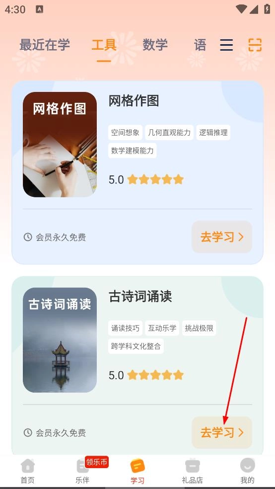 在乐学一百首页,点击学习,进入学习页面。