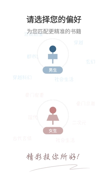 1、软件安装好后,进入后选择您的偏好会更加匹配精准的书籍。