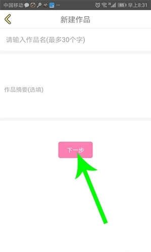 3.打开创建作品界面,设置作品名和作品摘要,然后点击“下一步”。