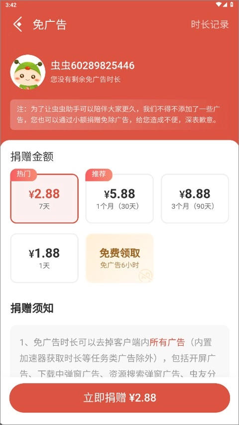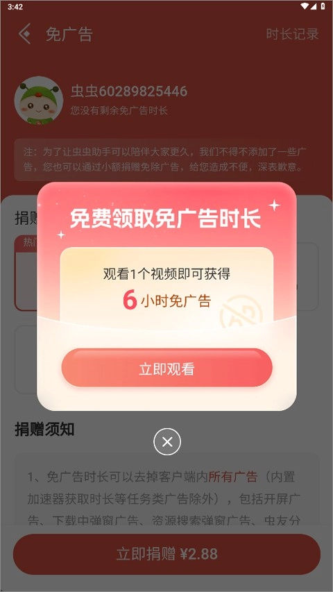 3、以及通过观看广告来免费领取时长。