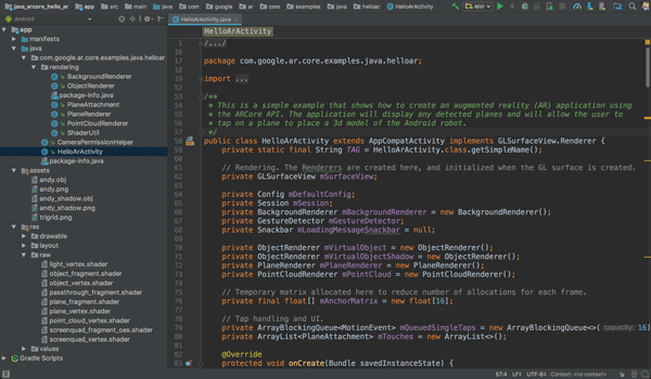 通过hello_ar_java应用,您能够在检测到的AR平面上放置一个三维ARCore典当。该应用借助Android GL SurfaceView来实现,Android GL SurfaceView主要用于渲染相机预览以及基本的AR对象,像平面和锚点等。在com/google/ar/core/examples/java/common/samplerender中能找到hello_ar_java的示例渲染框架。