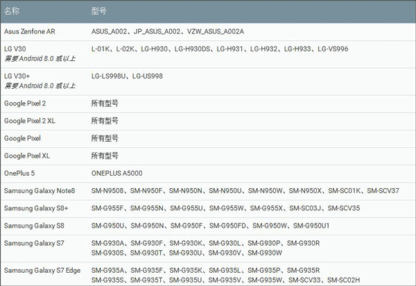 ARCore支持的机型,可在运行Android 7.0(Nougat)及更高版本系统的多种符合条件的安卓手机上使用。 在开发者预览版阶段,ARCore支持以下设备(如下图所示)。