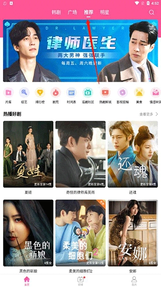 1、启动韩站应用后,首页呈现出韩剧、广场、推荐与明星这四大功能板块。进入“韩剧”频道,你可以浏览到当前最热门的优质剧集内容,这里涵盖了精选榜单、青春校园等多种不同分类。