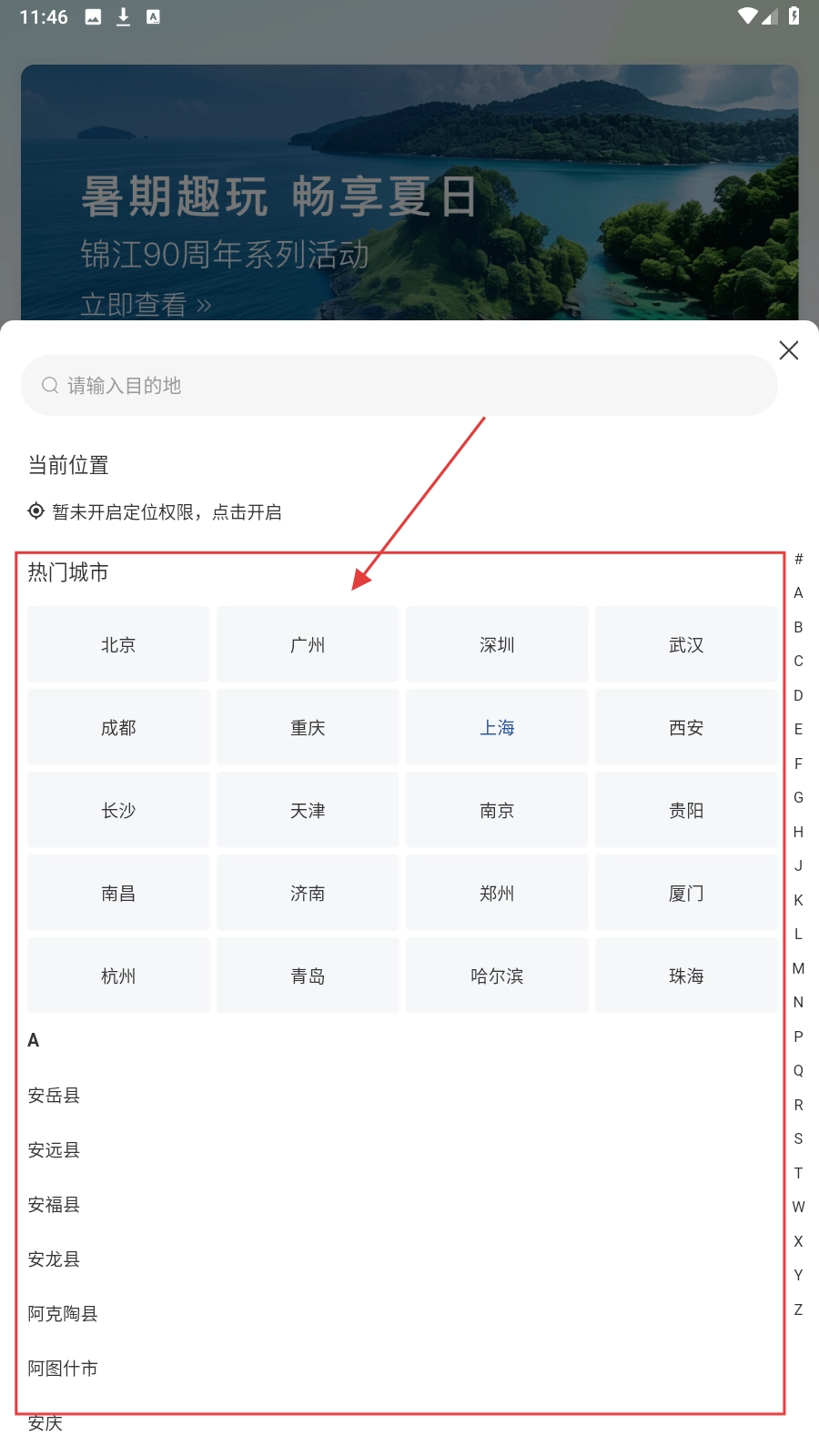 1、在城市选择界面,挑选你感兴趣的城市(例如【上海】),随后进入酒店预订页面。