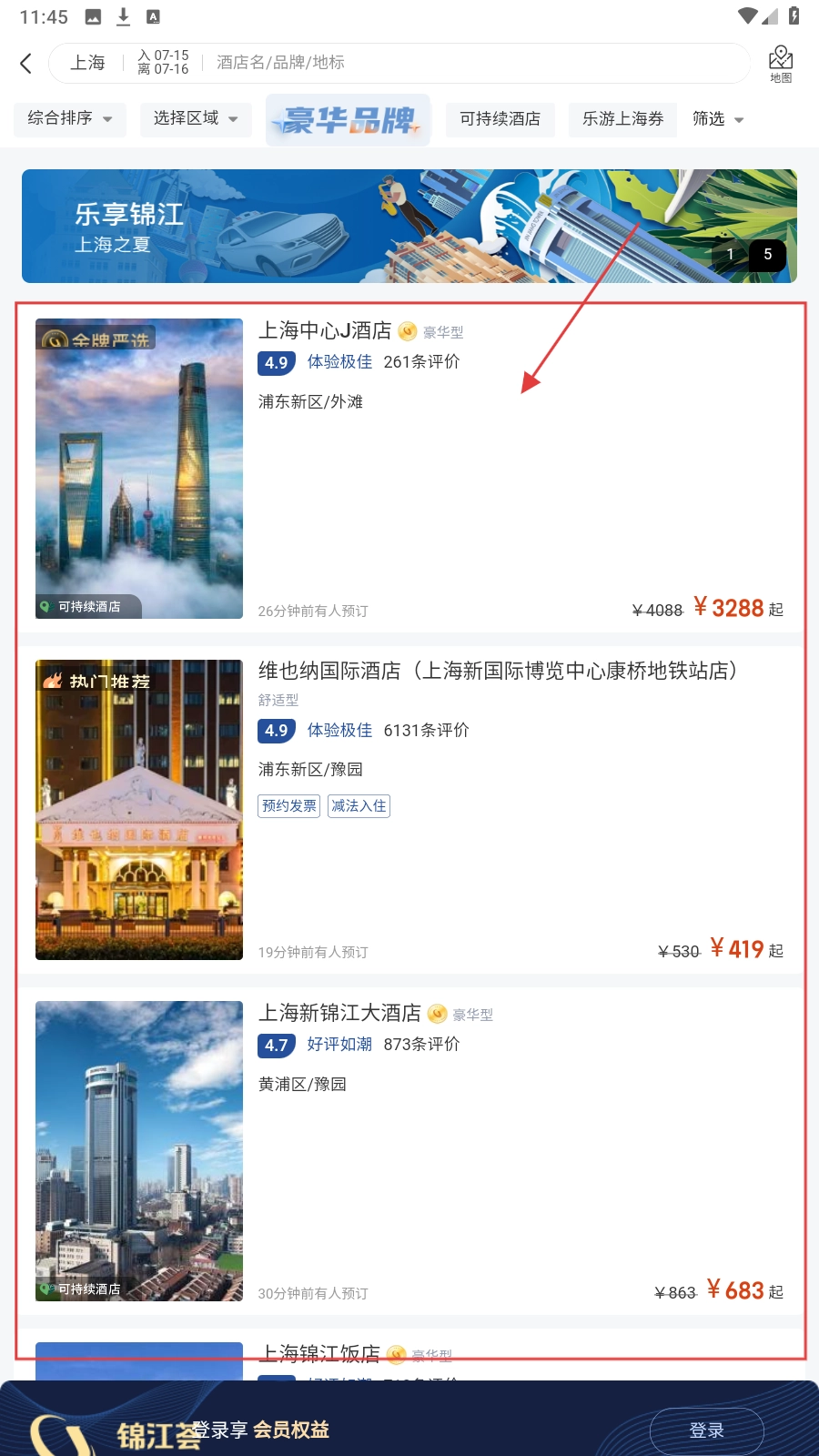 3、进入酒店预订页面后,浏览系统推荐的酒店列表,挑选出感兴趣的酒店并查看其详细信息。