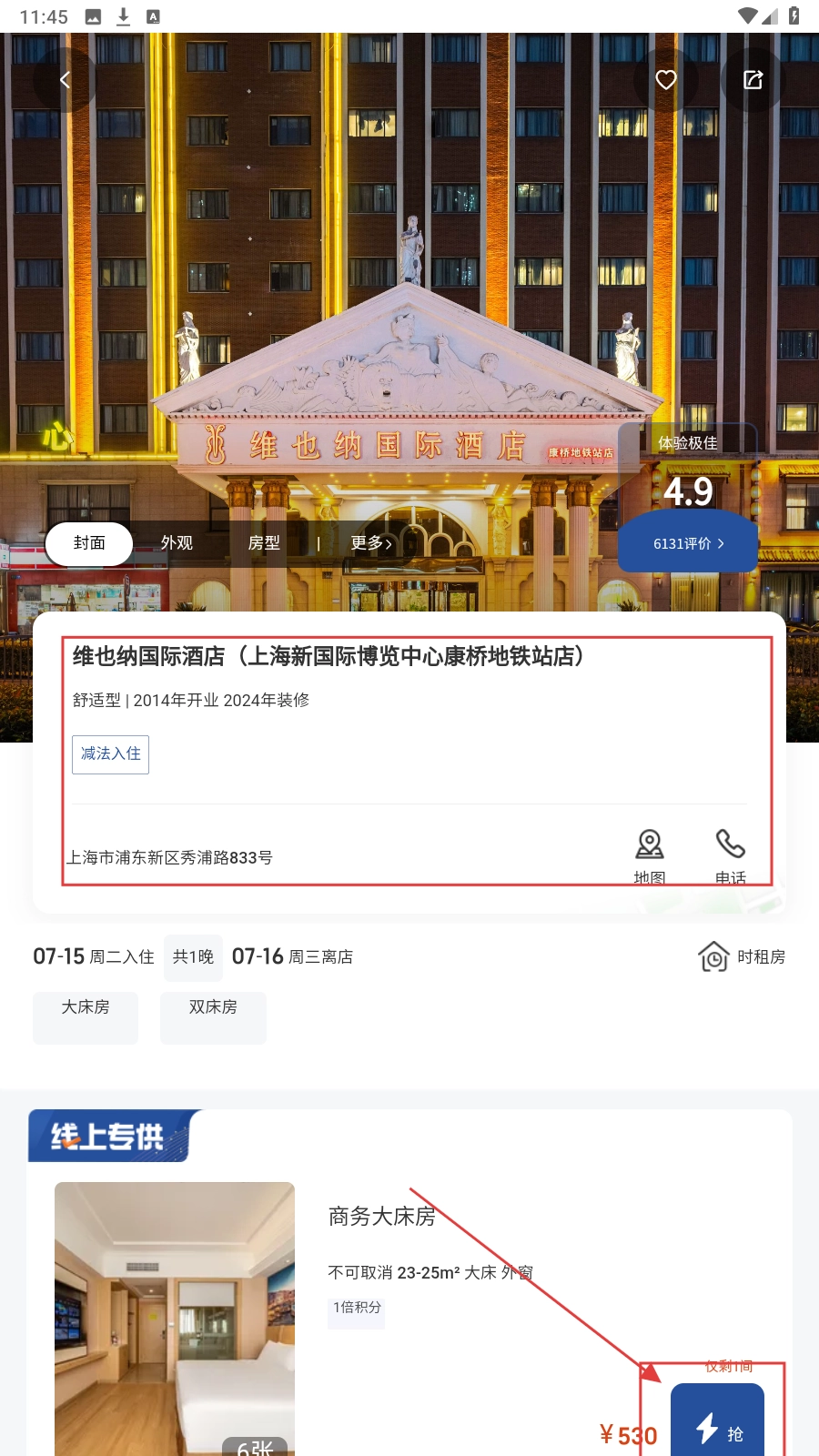 4、进入酒店详情页后,挑选房型并点击【抢】按钮,即可完成酒店预订。