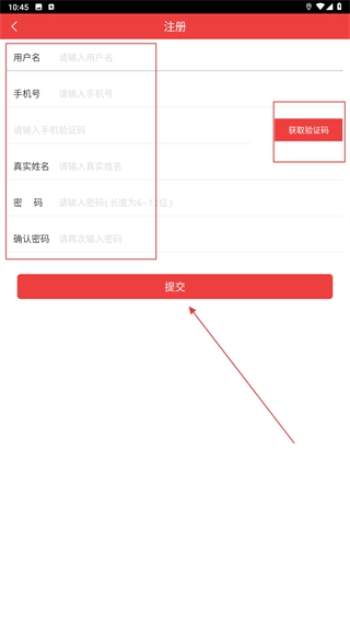 4、在注册页面按顺序填写用户名、手机号(点击【获取验证码】并补充验证码)、真实姓名、密码(包括确认密码),全部填写完毕后点击【提交】按钮即可完成注册流程。