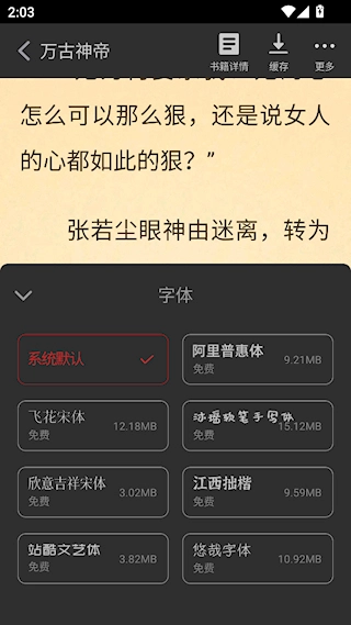 5、阅读体验舒适:字体大小、行距可按需调整,还提供多种字体供选择。
