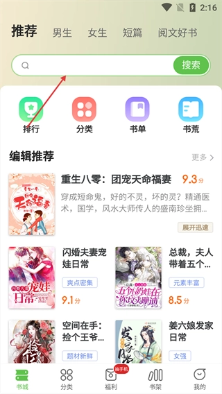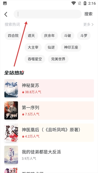 2、进入搜索界面后,输入小说名称,进行搜索。