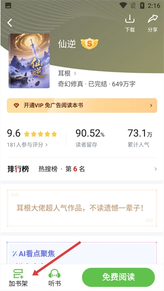 4、进入书籍详情页,点击【加书架】,收藏书籍。