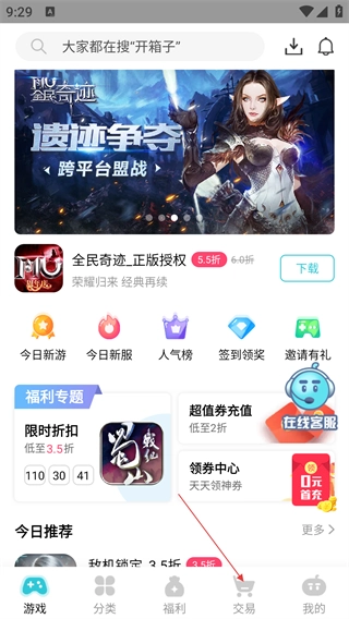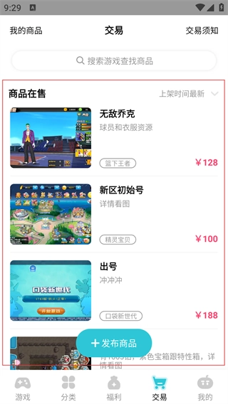 1、在应用首页点击底部的【交易】按钮,即可进入游戏商品的交易界面。