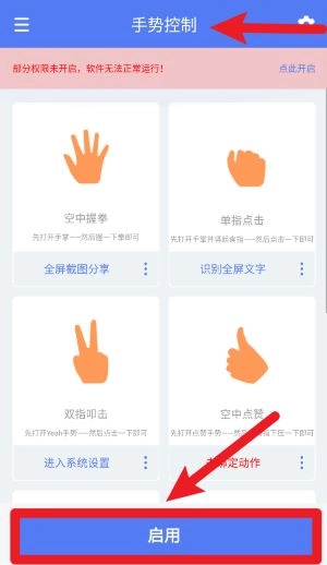 1、在主界面点击启用按钮前,请务必开启所需的必要权限,不然软件将无法准确识别手势动作。