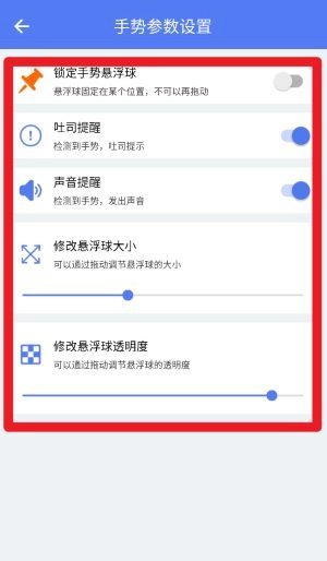 3、在手势参数设置里,能够对浮球的大小和透明度进行调整,还可以开启语音提示、吐司提醒这类反馈功能。