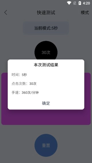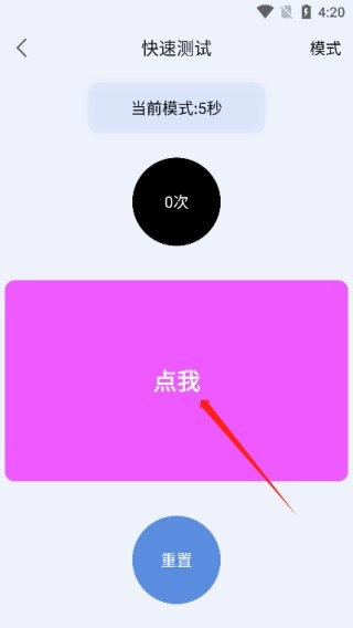 2、以快速点击为例,进入后右上角设有“模式”选项,通过该选项可以对点击测试的时间进行调整。