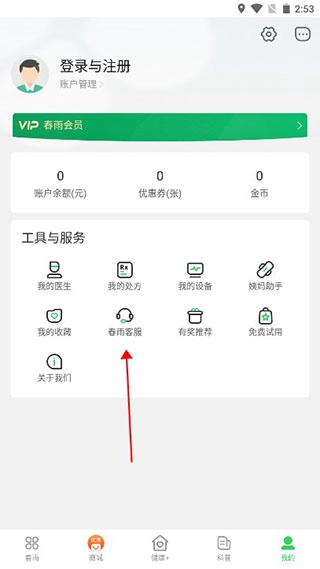 1、进入春雨医生的“个人中心”页面后,找到并点击“春雨客服”选项。