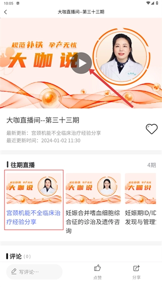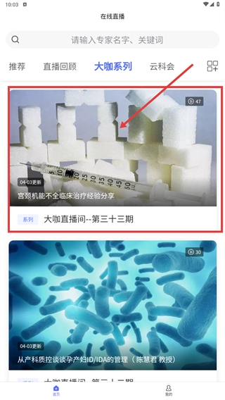 2、在大咖系列的直播列表里,找到你想观看的目标直播(比如“宫颈机能不全临床治疗经验分享”这场),点击该直播即可进入详情页面。