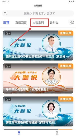 1、打开在线直播页面,点击【大咖系列】标签,即可切换到该分类对应的直播内容列表。