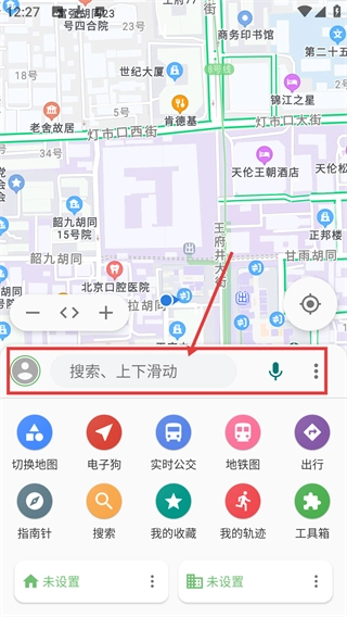 1、进入地图首页后,点击搜索栏即可激活输入框,既可以搜索地点,也能通过上下滑动来查看更多功能入口。