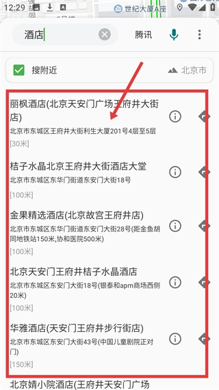 3、输入关键词后,系统会展示相关的地点列表,在列表中可以看到各个地点的距离与地址信息,这样能更方便地挑选出想要的目标地点。