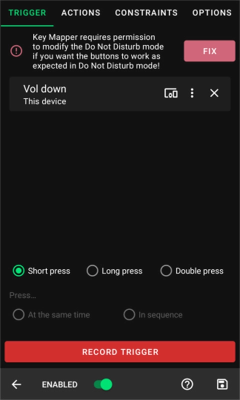 不管是哪种情况,第一步都得先记录一个触发器。你需要点击那个红色的“记录触发”按钮,接着按下你想修改功能的物理按键。在这份指南里,我会以“降低音量”为例来进行演示。