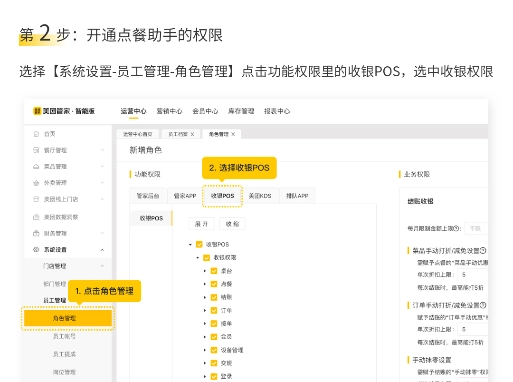 进入【系统设置】模块,依次点击【员工管理】-【角色管理】,在功能权限区域找到“收银POS”选项并点击,最后勾选“收银权限”即可。