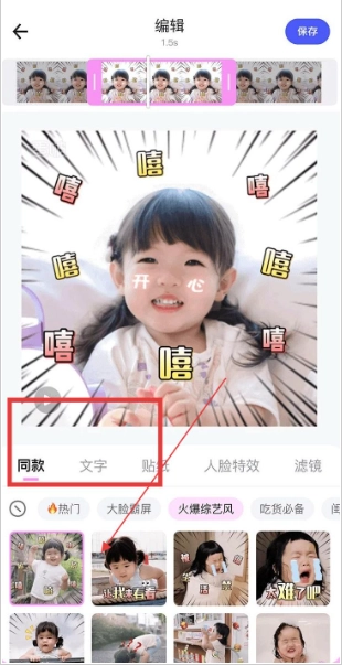 3、编辑界面里的同款专区,集合了当下热门的特效模板,点击就能直接使用,能让宝宝照片轻松添加趣味文字、贴纸和人脸特效,帮你快速打造充满创意的成长记录。