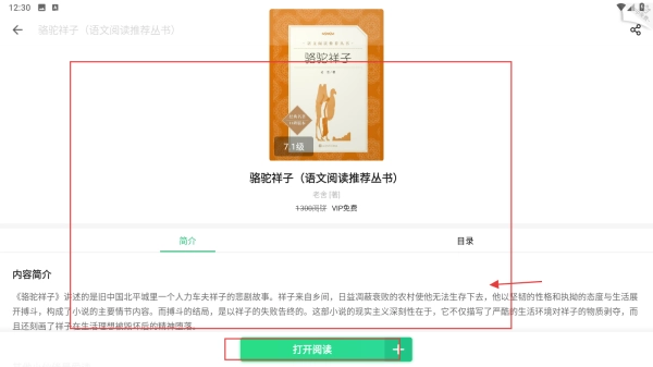 选择书籍(比如《骆驼祥子》),进入详情页面查看简介和目录,然后点击【打开阅读】按钮。