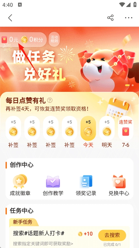 页面下方设有多种新手任务与创作任务,完成这些任务能够获取丰厚的积分奖励。