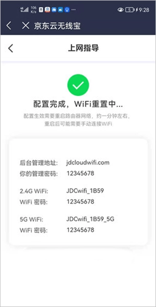 配置已生效,设备会自动存储刚才的设置项,同时WiFi连接会暂时中断。为了后续更便捷地管理设备,建议您对当前页面进行截图留存。