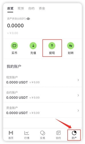点击“资产”,然后选择“提现”。