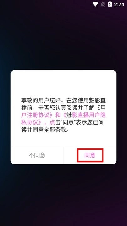 勾选同意《用户协议》与《魅影直播用户隐私协议》;