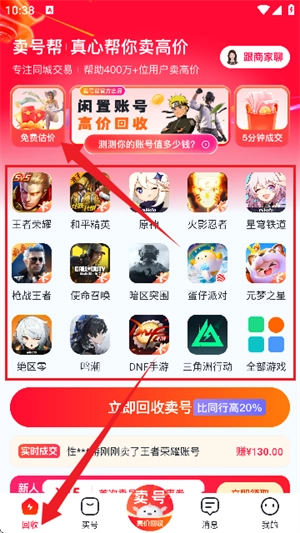 进入首页后,就像图中展示的那样,这里设有大量热门游戏账号回收和免费估价的功能入口。