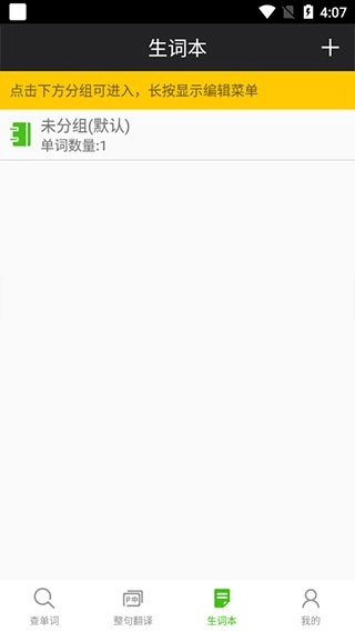 翻译后的句子或词语会被系统自动记录到生词本页面,若想学习相关内容,可在此处点击进行学习,同时也能对词语按照不同含义进行分组。