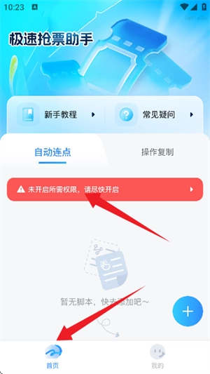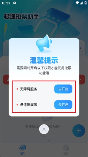 打开这个快速抢票工具的主界面后,第一步得允许它获取手机的一些权限,按照系统弹出来的指引一步步操作就行。
