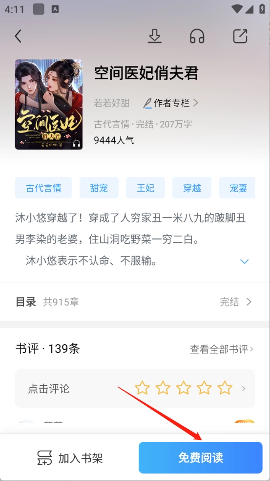 点开喜欢的小说进入详情页,点击“免费阅读”。