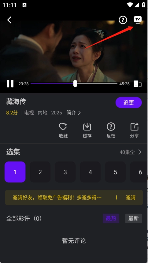 打开你想投屏的影视资源并进入播放界面,然后点击右上角的“TV”按钮。