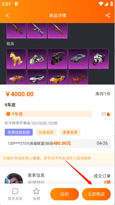 点击喜欢的游戏账号之后点击“立即购买”即可。