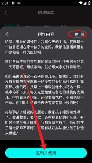 要是觉得内容不合心意,可点击页面右上角的【换一批】按钮重新生成;若对当前内容感到满意,则能直接点击底部的【复制并使用】按钮来获取内容。