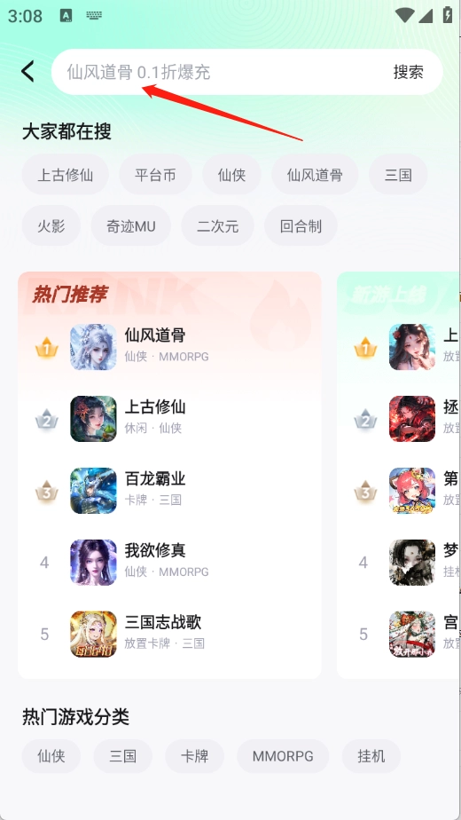 “找游戏”页面对游戏进行了细致分类,涵盖三国、传奇、卡牌等多种类型。