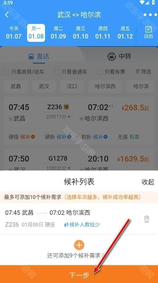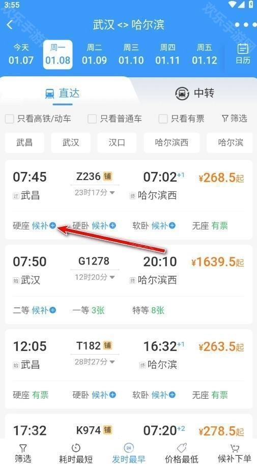 2.找到我们想要坐的班次,点击候补,如下图所示。