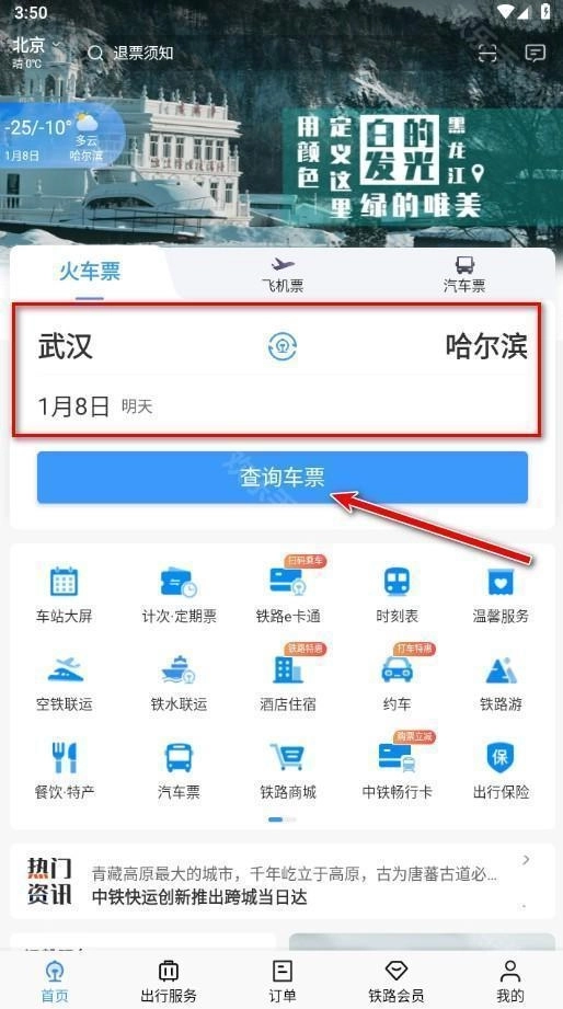 1.首先请在本网站下载并安装最新版的铁路12306应用,打开该软件进入首页后,选择您计划乘坐的车型,接着设置好出发地与目的地,选定出行时间,随后点击“查询车票”按钮即可。