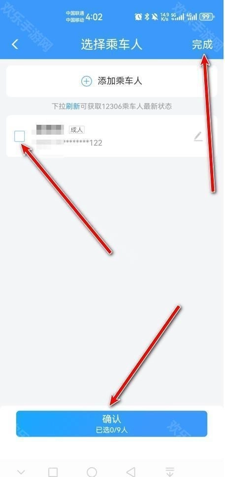 7.勾选乘车人后点击确认,接着点击完成,之后按照软件的提示进行操作,就能完成预约抢票了。