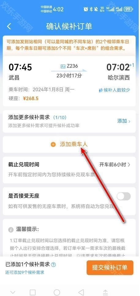 4、在查询结果里选定您计划搭乘的列车,接着在相应界面中核实您所选的席别,之后点击“添加乘客”按钮来添加该列车的乘客(支持多选),勾选好联系人后,点击右上角的“确认选择”按钮完成联系人的选定。