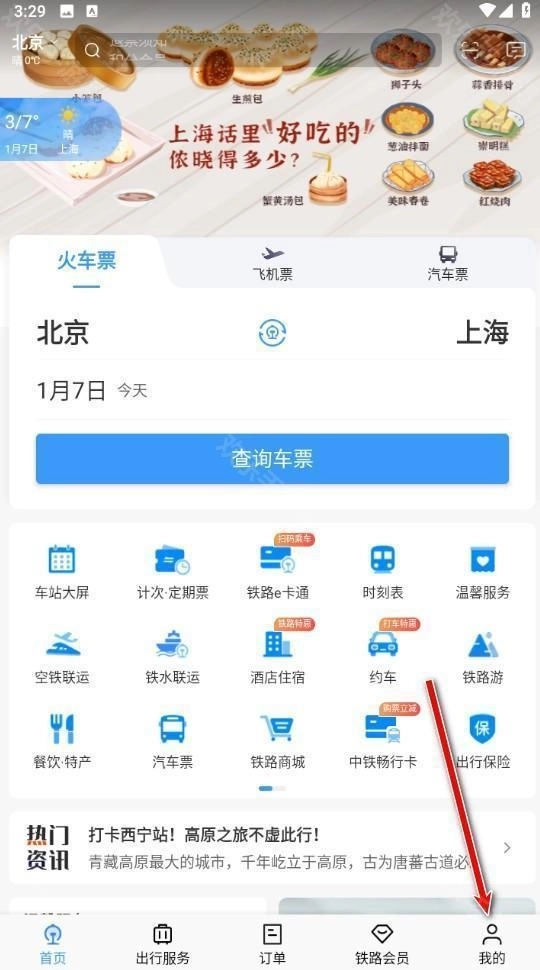 1.首先请在本网站的当前页面安装最新版的铁路12306,打开该软件进入首页后,点击右下角的“我的”选项。