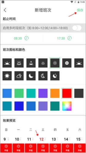2、给班次取一个名称,设置起止时间,选择你喜欢的班次图标和颜色,查看下方设置的预览效果,是自己喜欢的那种就可以进行保存了。