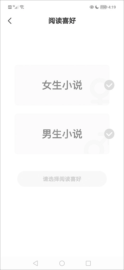 3、进入阅读喜好,选择阅读喜好类型,点击【确认选择】。