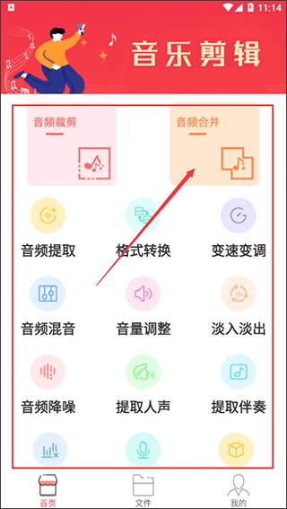 1、用户安装打开软件就可以使用:音频裁剪、音频合并、音频提取、格式转换、变速变调等功能,大家可以从中找到自己需要的功能进入,小编以音频合并为例;